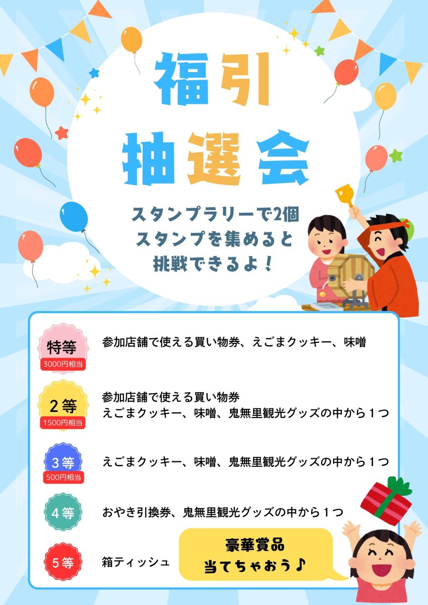 参加店舗・施設を巡るスタンプラリーに参加し、スタンプを2個集めると福引のチャンス!特等は3000円相当の買い物券や商品をプレゼントします🌸