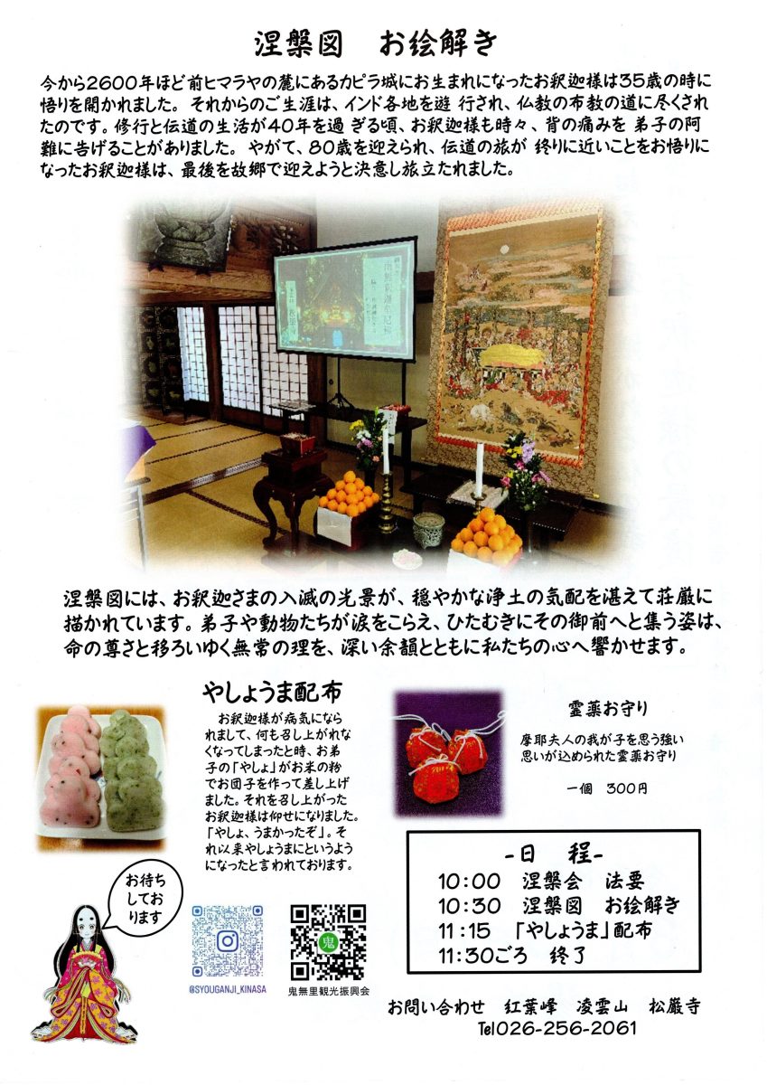 「鬼女紅葉」の菩提寺として守護仏地蔵尊をまつる松巌寺で涅槃会、涅槃図のお絵解き、「やしょうま」の配布があります。
